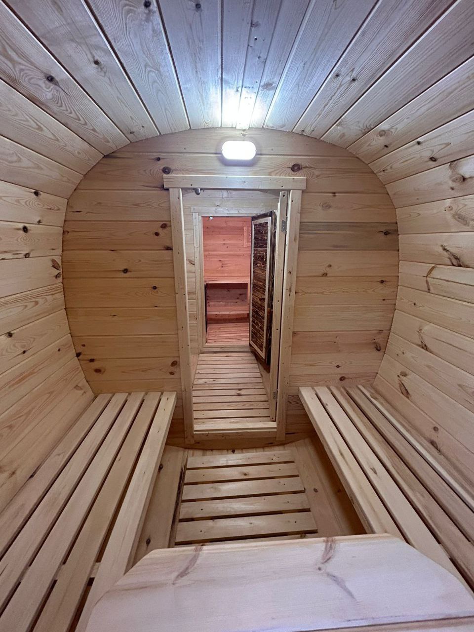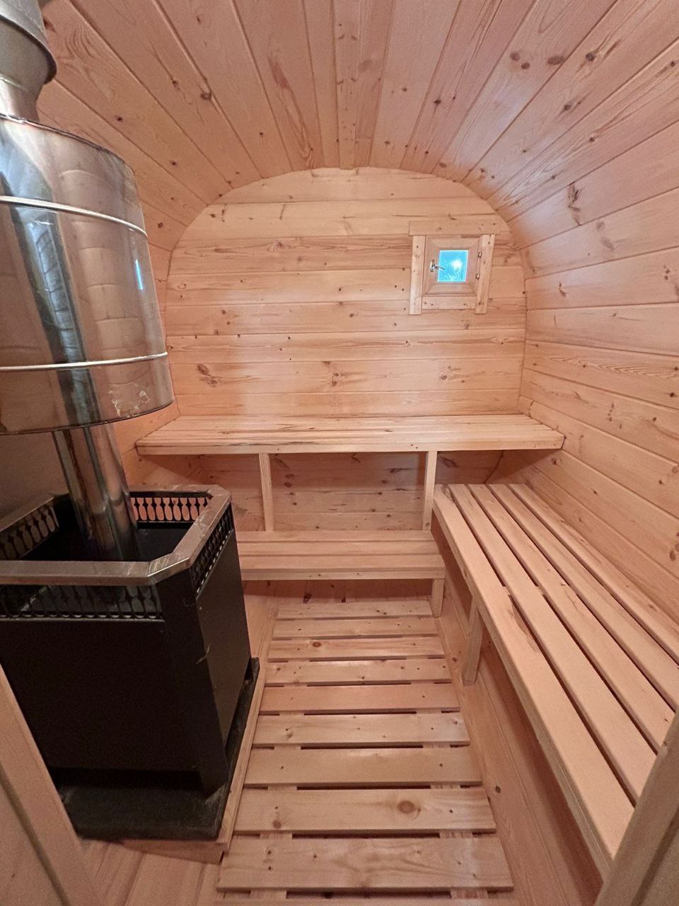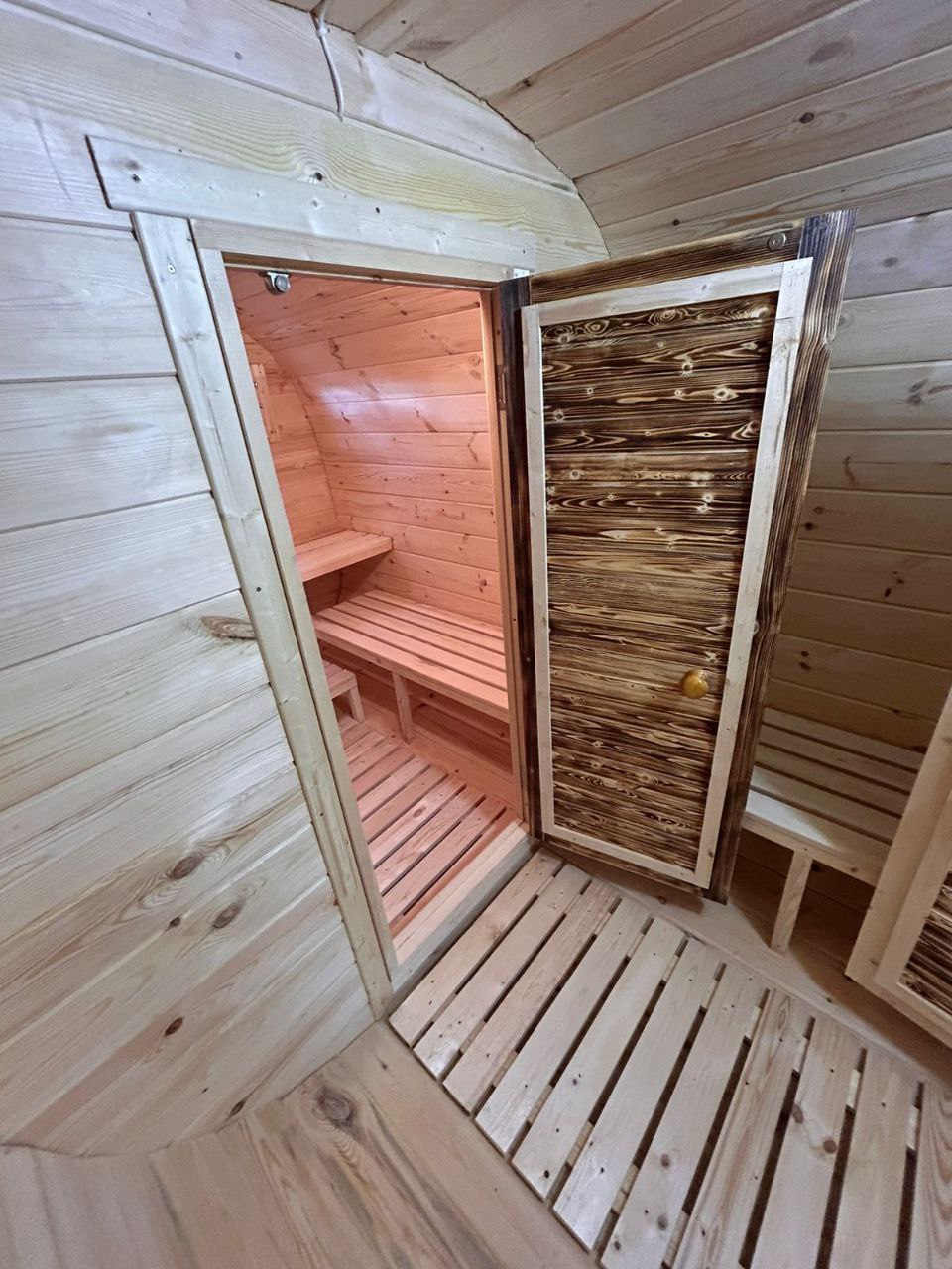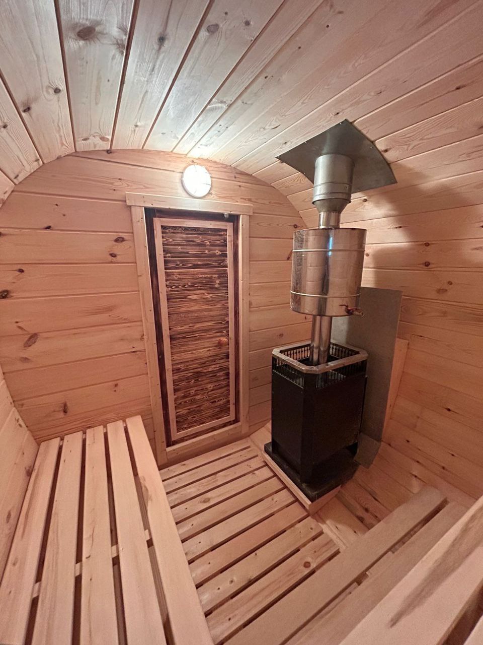- Экономия пространства: благодаря своей цилиндрической форме, баня-бочка занимает минимум места на участке, но при этом предоставляет достаточно пространства для комфортного пребывания.